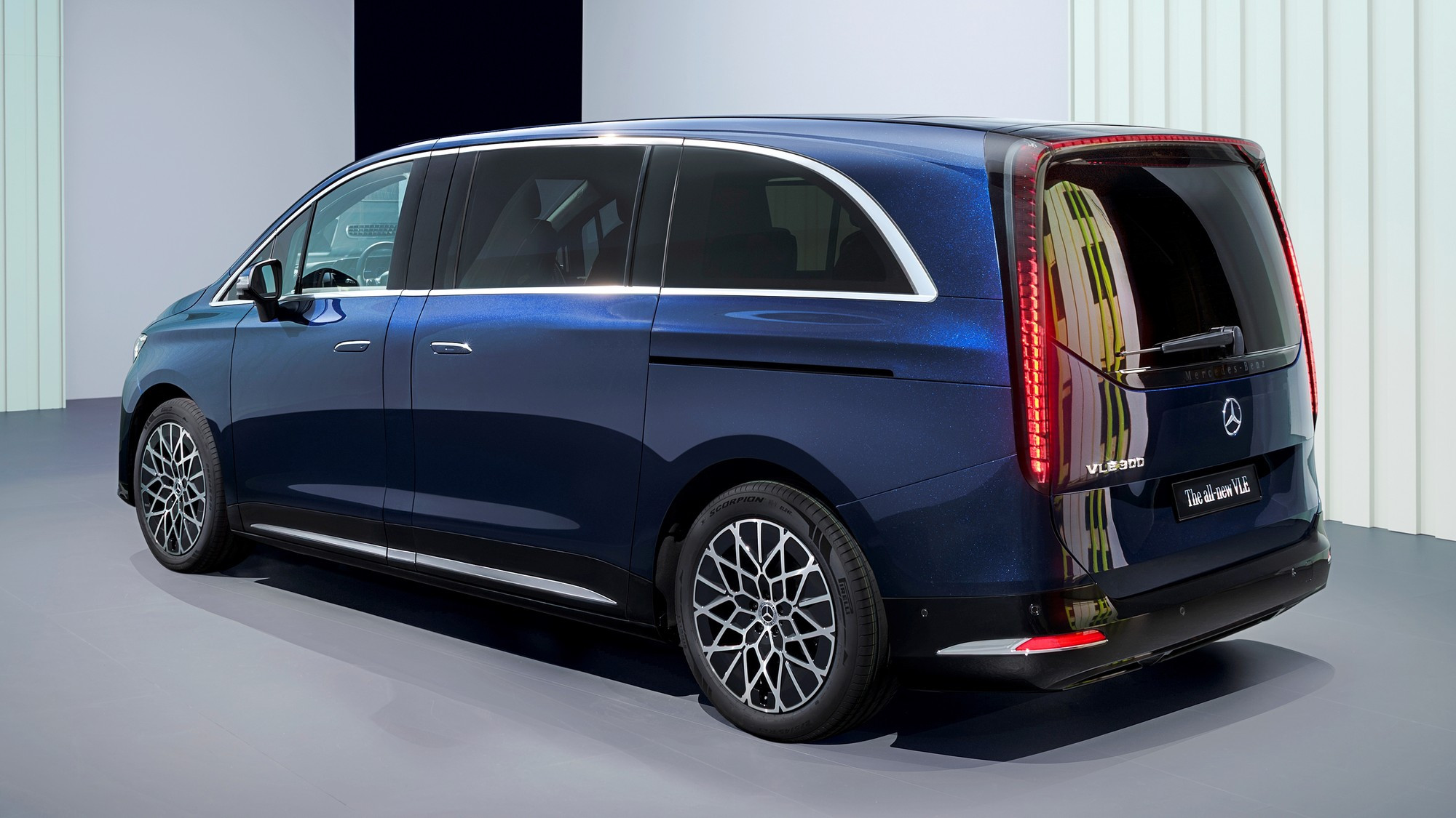 Версия VLE 300 electric одномоторная переднеприводная мощностью 203 кВт (276 л.с.), на одной зарядке она может проехать более 700 км по циклу WLTP. Двухмоторная полноприводная версия VLE 400 4Matic electric располагает мощностью более 300 кВт (408 л.с.) и способна разогнаться до 100 км/ч за 6,5 с, её запас хода на одной зарядке в пресс-релизе не указан. В оснащении заявлены регулируемая по высоте в пределах 40 мм адаптивная пневмоподвеска Airmatic и полноуправляемое шасси: задние колёса могут поворачиваться на угол до семи градусов, благодаря чему диаметр разворота стандартной версии минивэна составляет всего 10,9 м.